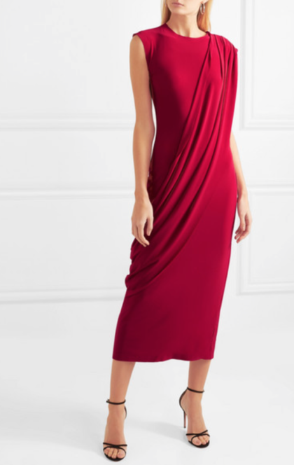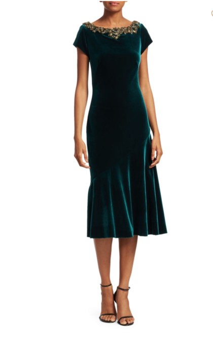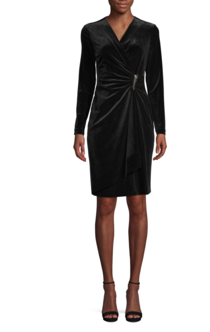 For holiday office parties, I like to err on the side of conservatism (and still abide by all the “rules” of professional dressing), but play it up with the fabrics and textures in the outfit! This dress has office-appropriate coverage with long sleeves and a modest length, but the rich hued velvet lends a festive touch. Bonus: the ruched side is one of my favorite features on dresses in general – this detail works magic on camouflaging a tummy after indulging in holiday treats! I’d style this with closed-toe pumps (satin ankle strap ones for a little extra flair) and jeweled stud earrings.